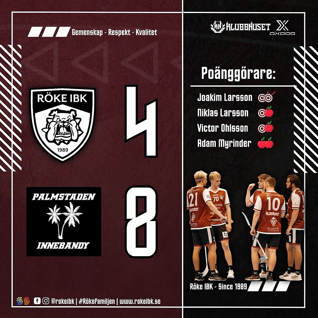 Våra herrar fick en tuff start i dagens hemmamatch mot Palmstaden IK. Redan efter 21 minuters spel ledde gästerna med 3-0. Trots ett tremålsunderläge kämpade våra grabbar väl och lyckades krympa måldifferensen till ett ynka mål (3-4 och 4-5). Tyvärr lyckades Palmstaden IK peta in tre mål under matchens sista minuter och vann till slut med klara 8-4.